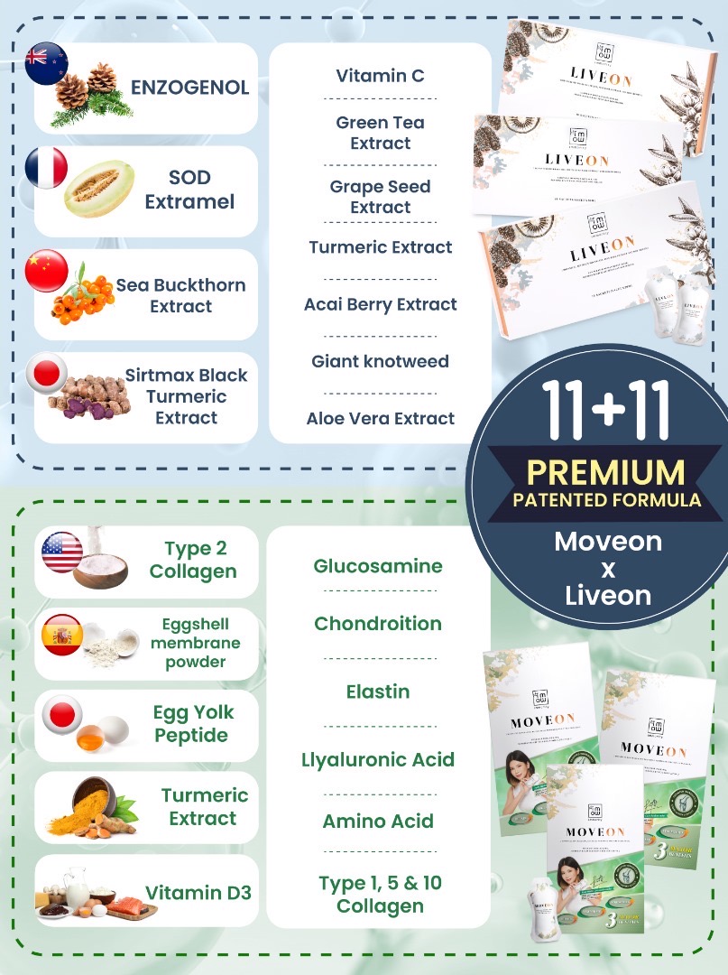 Moveon Liveon is first doctor-developed and made with clinically 7 patented ingredients from the USA, Japan, Spain, and France. Unlike ordinary supplements that only mask pain, this dual formula targets the root causes — reducing inflammation, rebuilding cartilage, and restoring joint fluid for long-term recovery.
